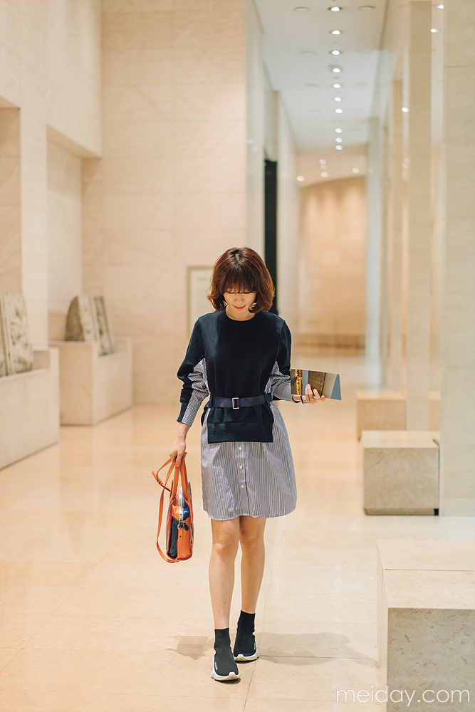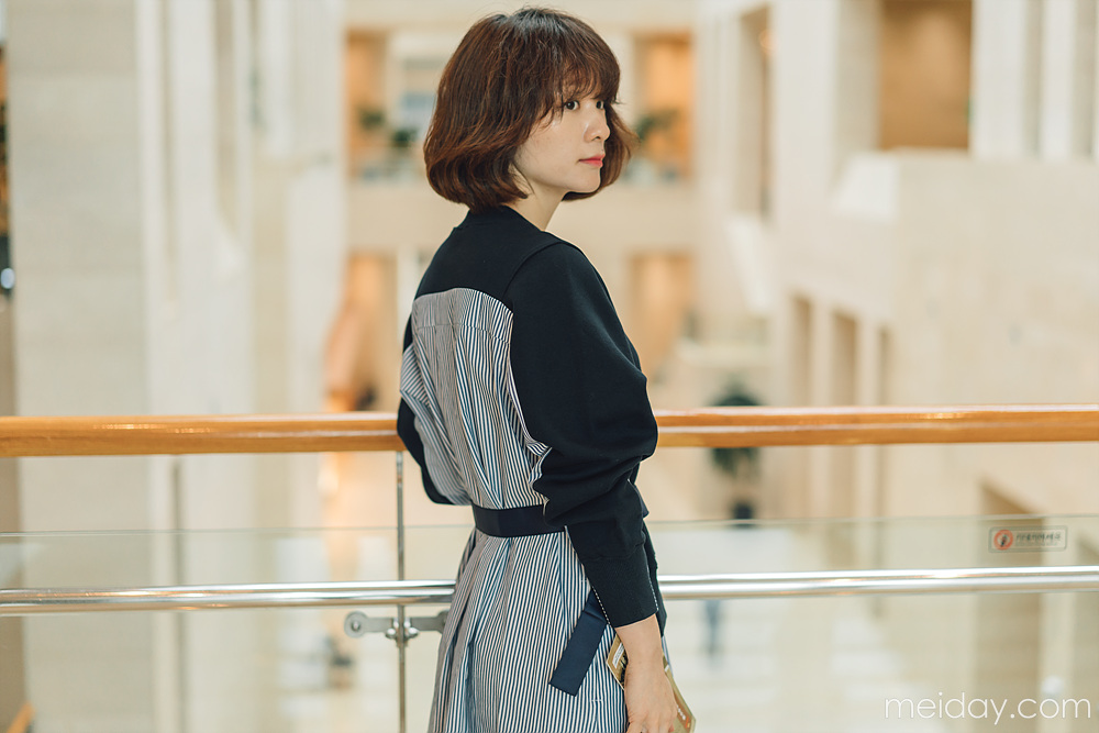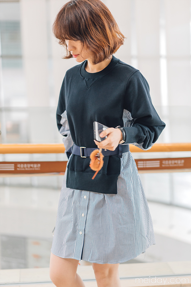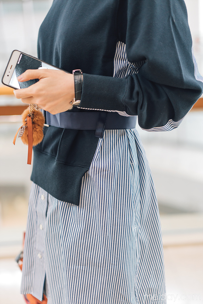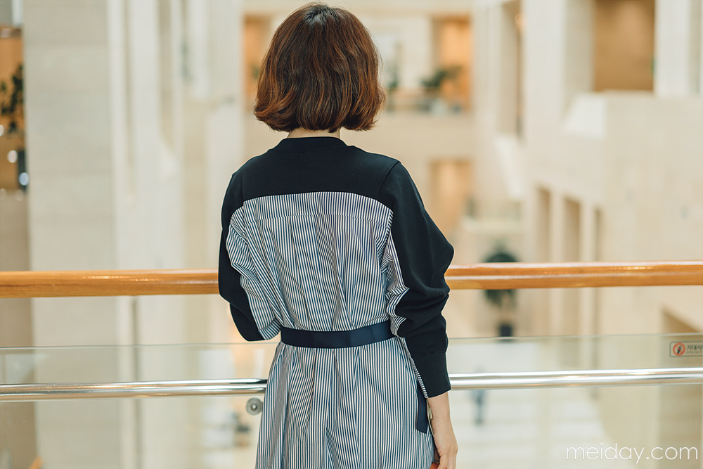 maj★衬衣裙,特别显气质的一款~设计也非常的有意思~前半部分是卫衣设计,后半部分是卫衬衣设计,腰间和袖口部分都做了两种面料的交叉设计,非常的独特有设计感~ 搭配上腰带,时尚度UP UP UP! 膝盖以上三公分,最显瘦的长度~ 而且,裙摆处不仅有可爱的纽扣设计,裙摆圆弧剪裁特别的有型,不像很多设计感不强的衬衣裙,很容易紧贴臀部或者大腿部,无法对身材做出良好的修饰~ 一件通勤的好看衬衣裙,简单却大牌质感,经典色的拼接 适合这个季节的穿着~