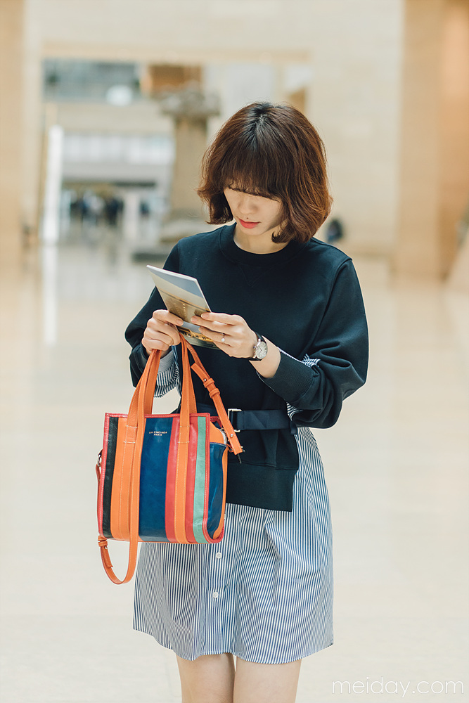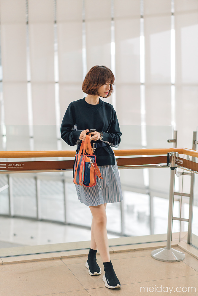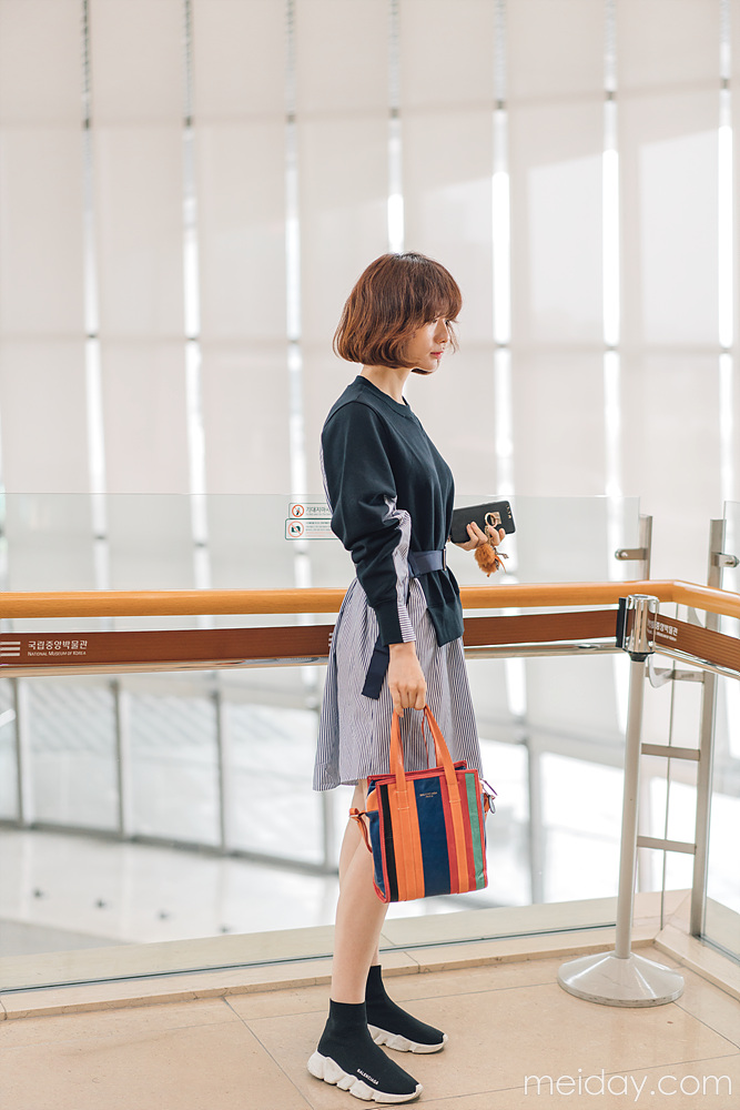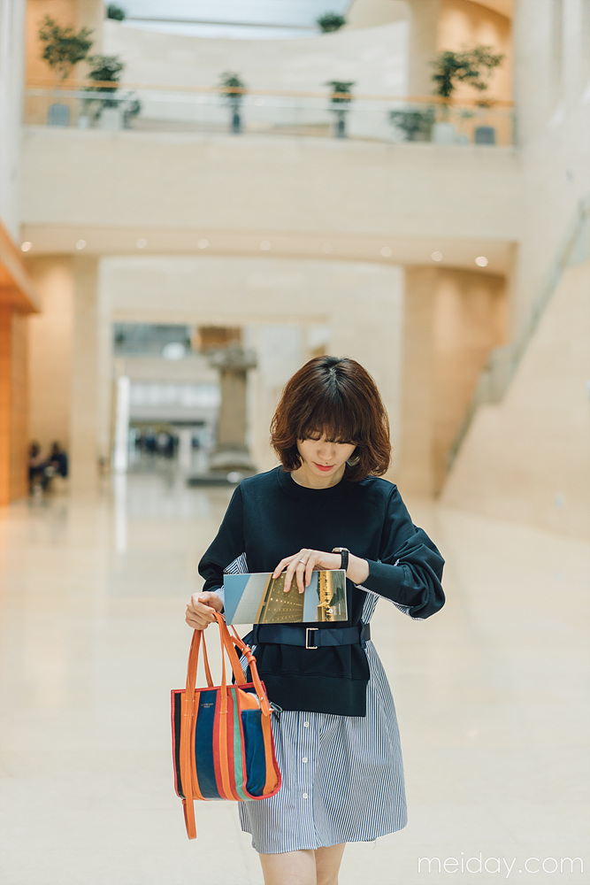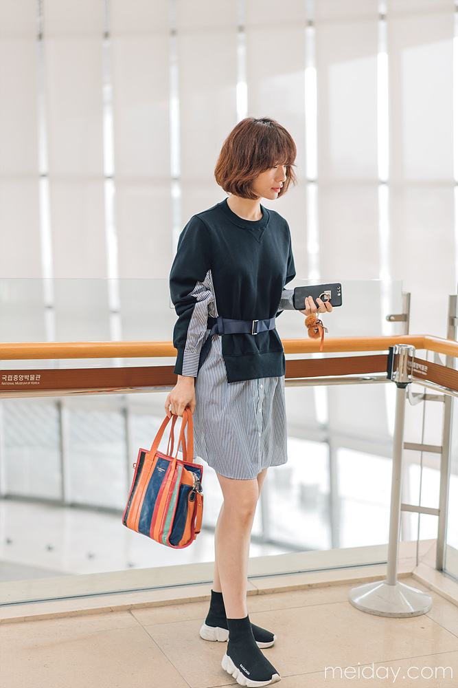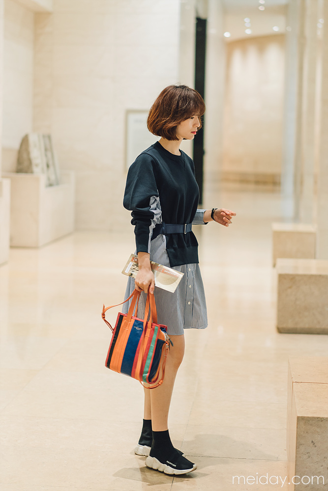 maj★衬衣裙,特别显气质的一款~设计也非常的有意思~前半部分是卫衣设计,后半部分是卫衬衣设计,腰间和袖口部分都做了两种面料的交叉设计,非常的独特有设计感~ 搭配上腰带,时尚度UP UP UP! 膝盖以上三公分,最显瘦的长度~ 而且,裙摆处不仅有可爱的纽扣设计,裙摆圆弧剪裁特别的有型,不像很多设计感不强的衬衣裙,很容易紧贴臀部或者大腿部,无法对身材做出良好的修饰~ 一件通勤的好看衬衣裙,简单却大牌质感,经典色的拼接 适合这个季节的穿着~