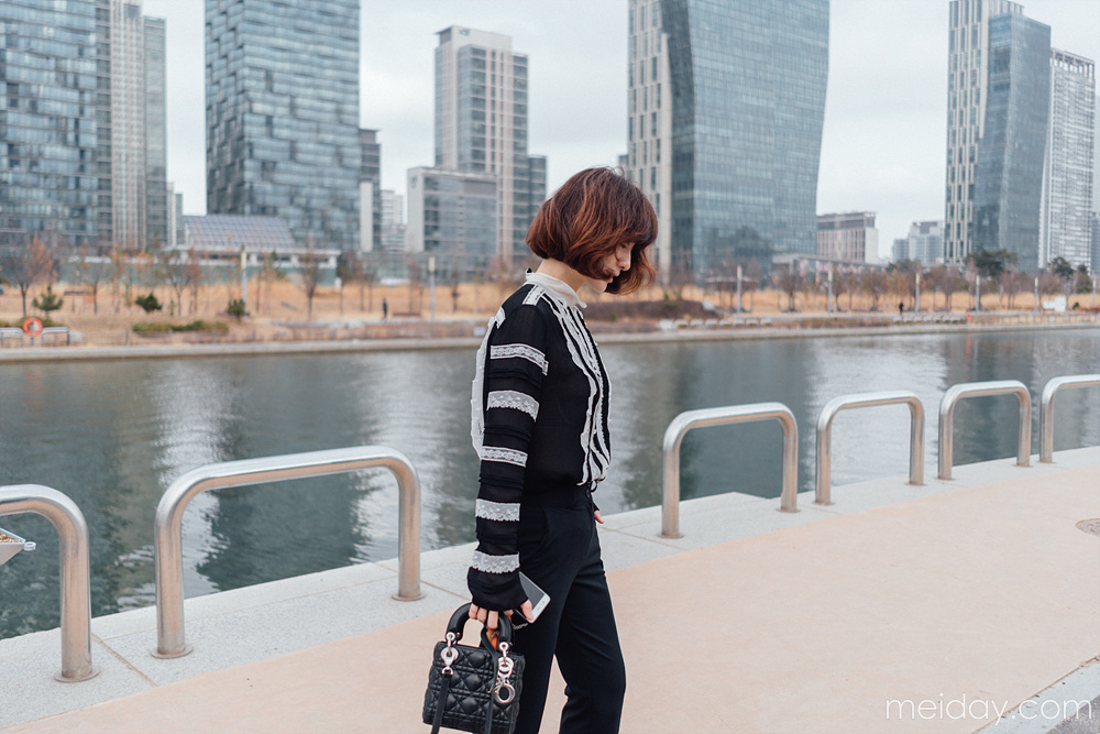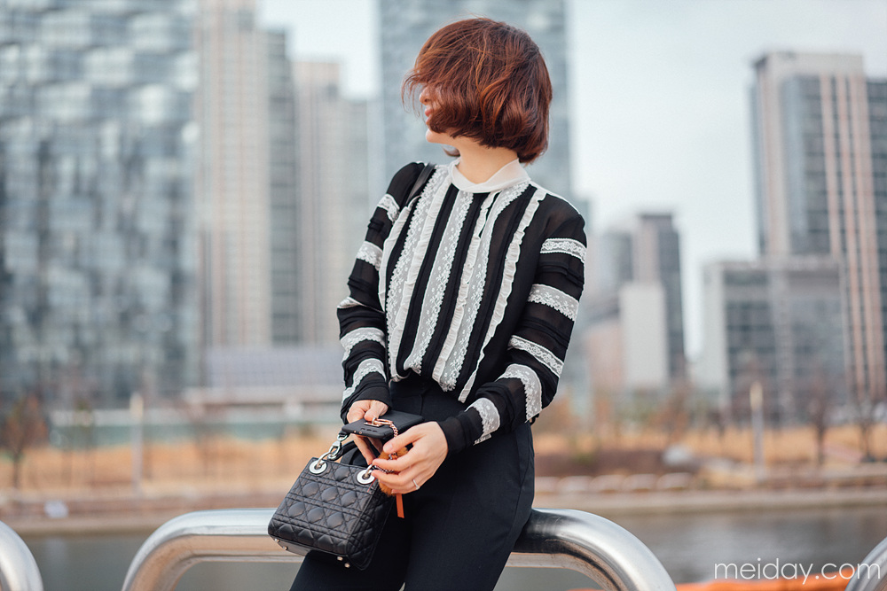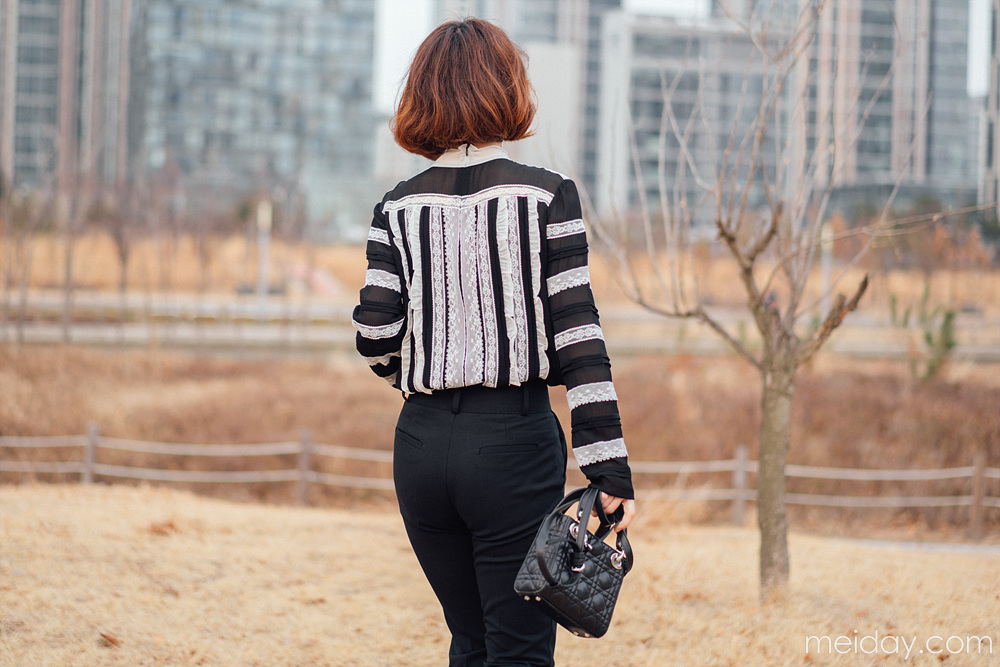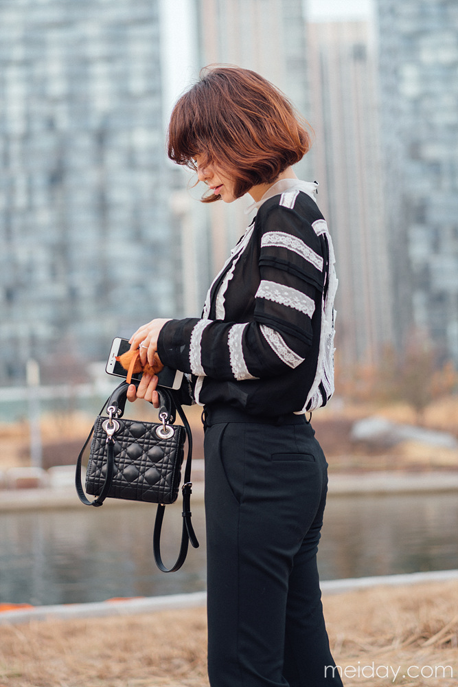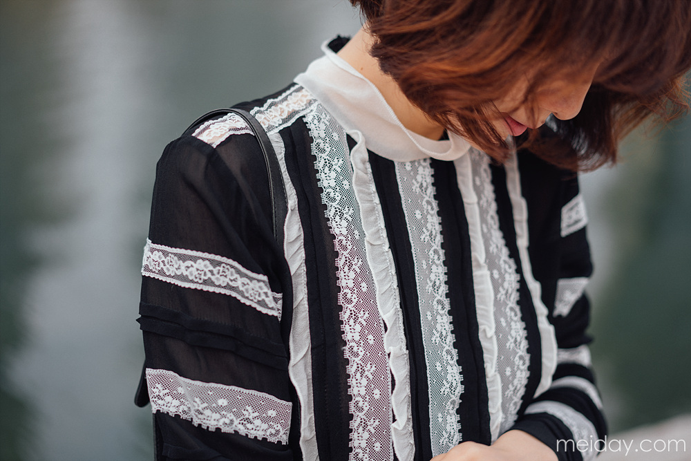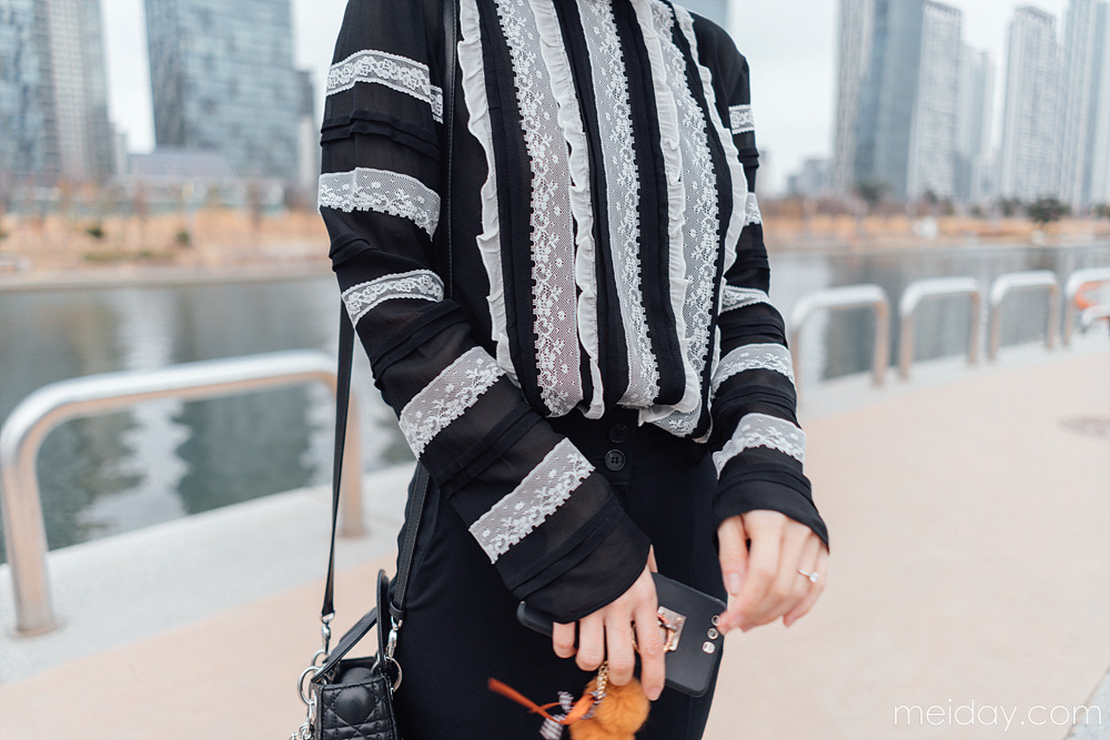 Valentio★(华伦天★)真丝雪纺衬衣,磨砂质感的的隐约透纱感,拼接紧致的蕾丝花边和褶皱花边,十分的精致细腻,所有的拼接都层次分明,立体好看~ 白色的磨砂感小立领也俏皮的可爱~而且值得一提的是,她带着独特的磨砂质感,这个真的超级少见,很是特别~不是一般的雪纺,很直接的透明,他是隔着一层磨砂的质感,而且前面一点都不透,搭配肉色或者黑色的内衣,完全能够hold住~ 如果比较保守,里面可以搭配一件薄的黑色吊带内搭~ 总之,这件衬衣很valentio, 女人味中带着帅气和洒脱,抛开铆钉,她依旧能把这种感觉做的淋漓尽致~