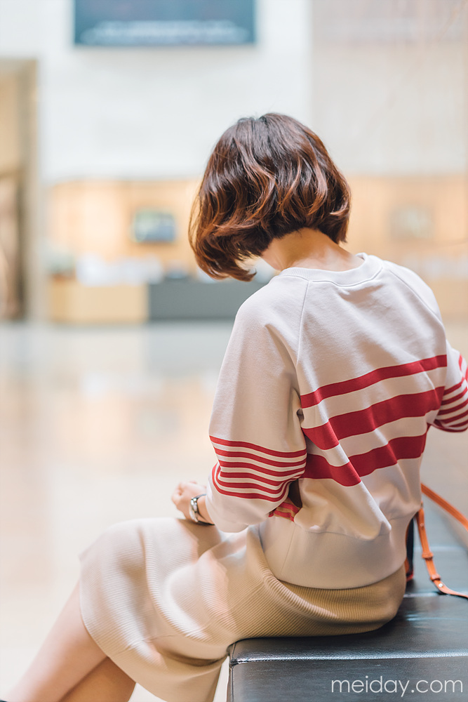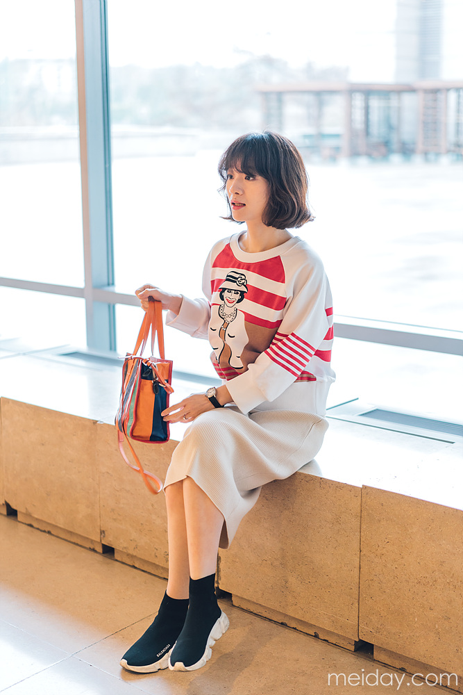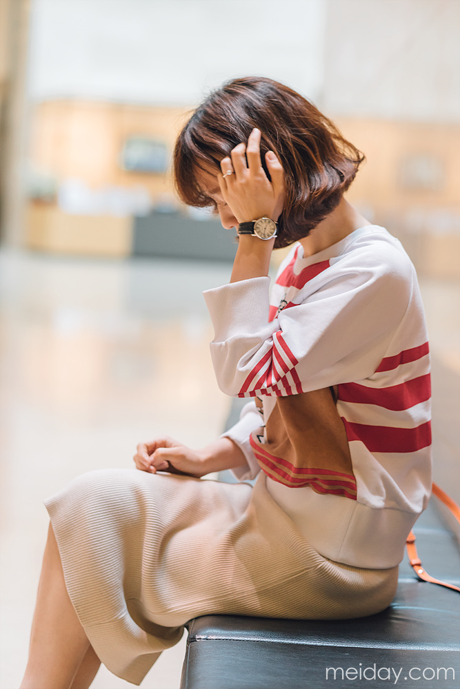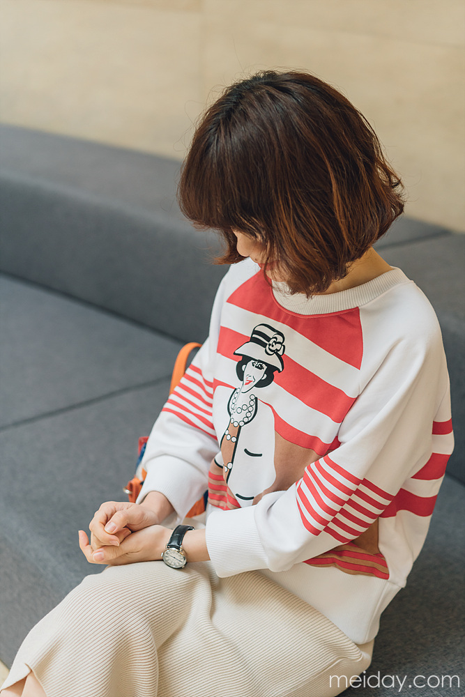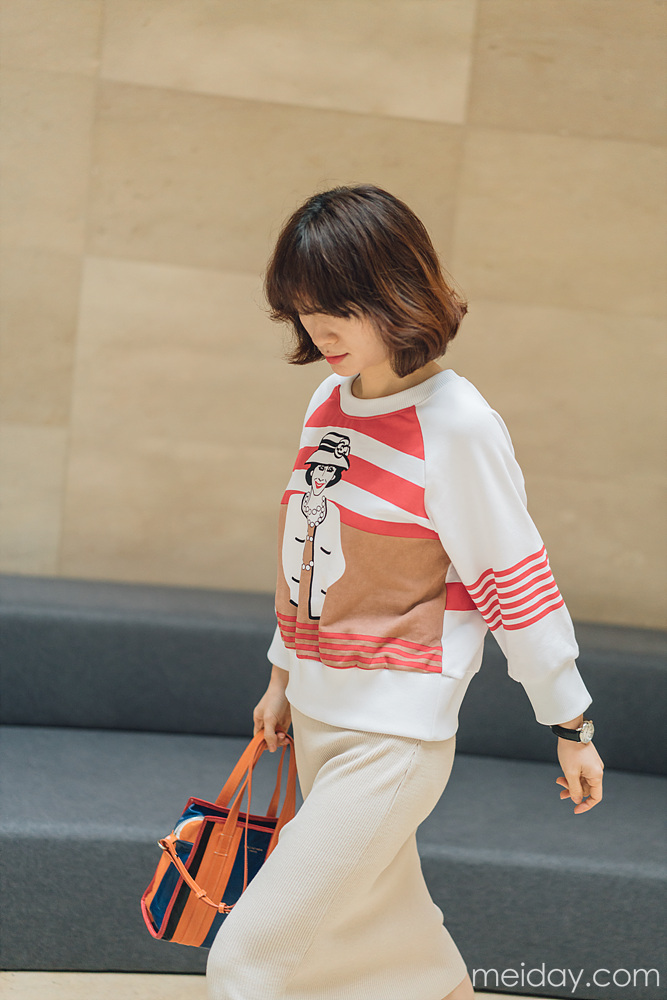 小香奶奶轻薄卫衣,红米白的金典三色拼接,加上不规则条纹元素拼接你,让这件卫衣已经显得活泼可爱!正面大胆的象奶奶独家经典造型,也只有小香家自己敢这么“放肆”了!臀部处的螺旋纹收口,微微修饰的腰部线条,都让人不经意间觉得好看~和一般卫衣相比,稍微短小的尺寸,让我们对于卫衣的概念不仅是运动感搭配,还可以有更多种优雅的可能~ 也如象奶奶,不仅仅只有正襟危坐的贵妇感~我想这就是这件小香卫衣想要带给我们的讯息~ meiday搭配了前几期的薄款针织裙~