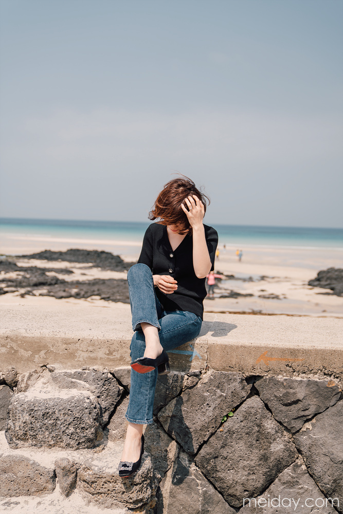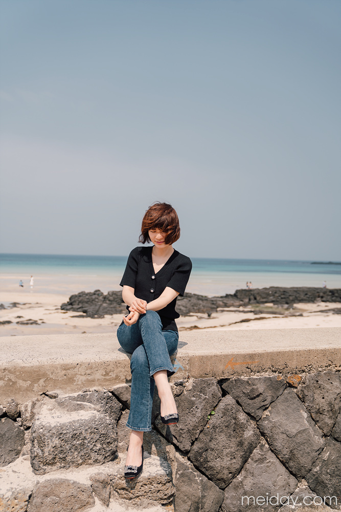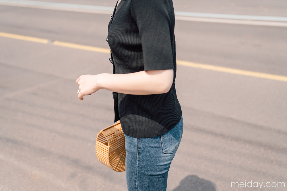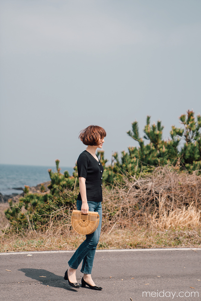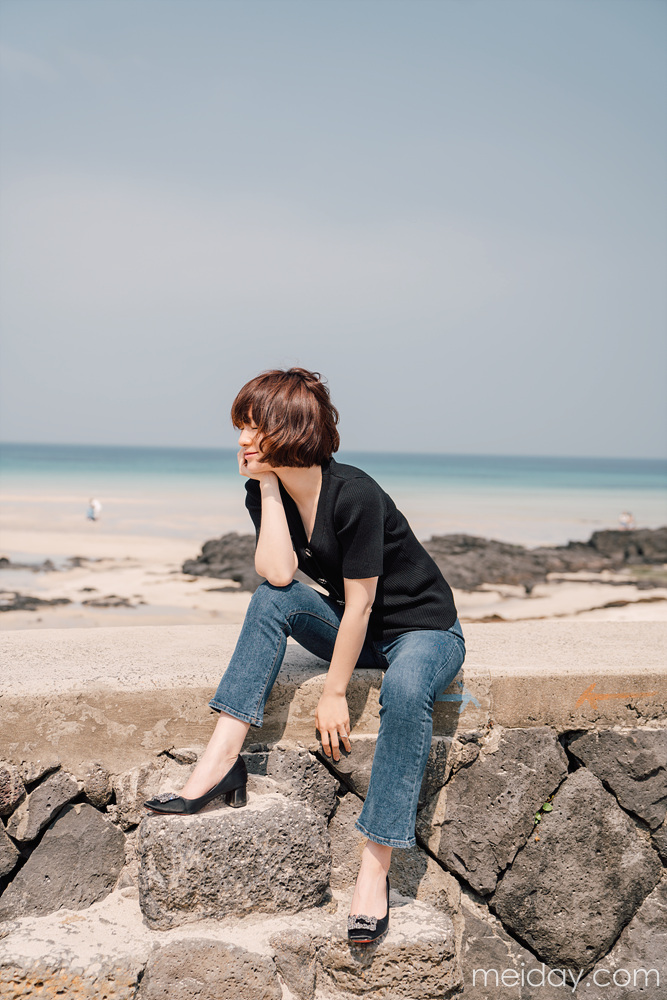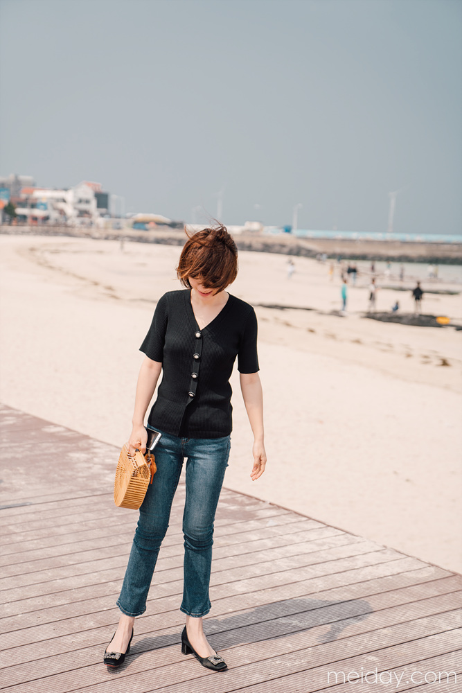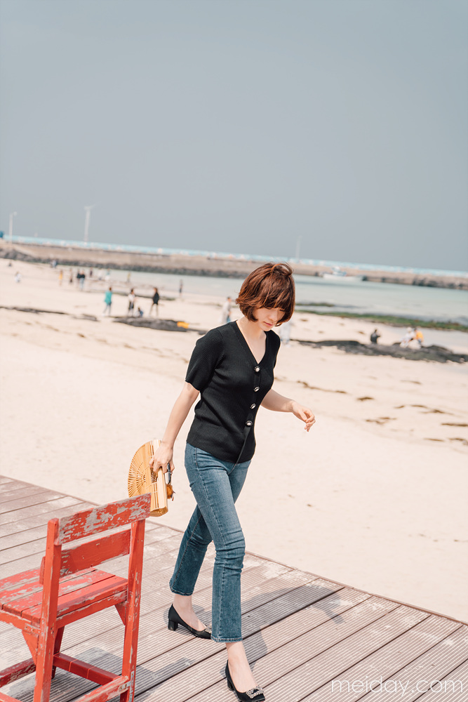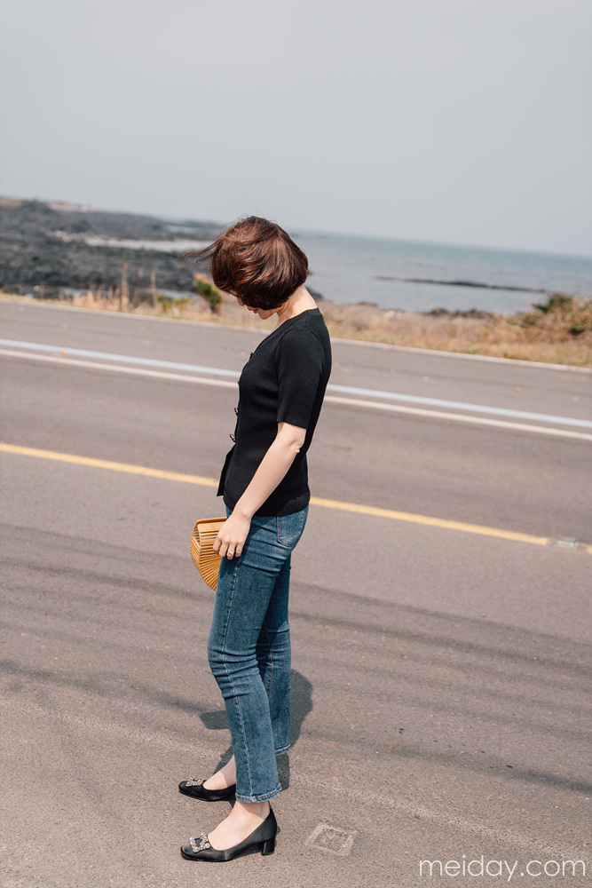 超级适合春夏穿着的一件短袖弹性针织衫~ 不同于一般的紧身针织衫,这件针织衫是相对宽松的,会把你的身形修饰成她“设计”好的样子~ V字领的设计,让颈部线条看上去更修长~珍珠做成的小花纽扣,别致好看,而且特别有女人味~ 也让整件衣服重点突出,干净素雅里带着一份特别的感觉~ 这件衣服的设计其实有一种小帅气合小慵懒交融的小性感~ 黑白两色都各自有各自的感觉~可以根据喜好选择~ 面料透气轻薄,弹性极好,绝不会有闷热感,很适合春夏穿着~